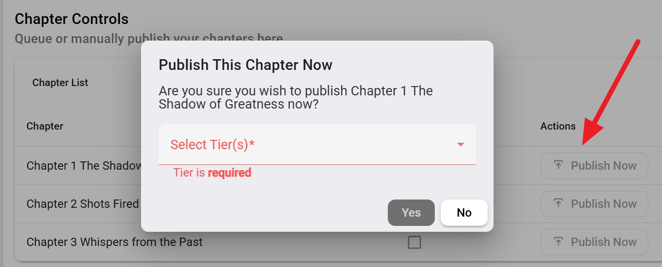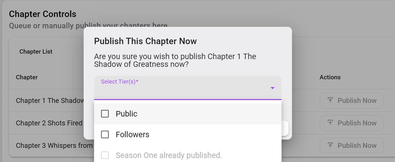 - Select Publish Now for Each Chapter to select another 'tier' option