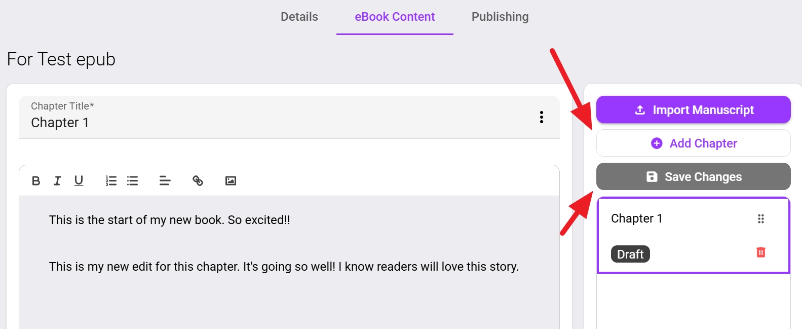 Here you can add the story chapter by chapter. Always Save any changes before navigating away.